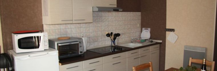 1 cuisine équipée : plaque 4 feux vitro, four, réfrigérateur avec compartiment congélation, micro-ondes, cafetière, bouilloire et grille-pain.